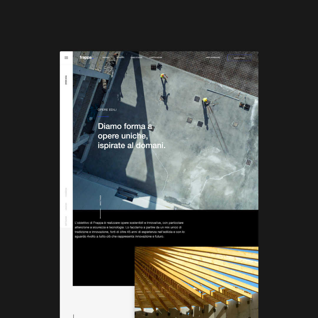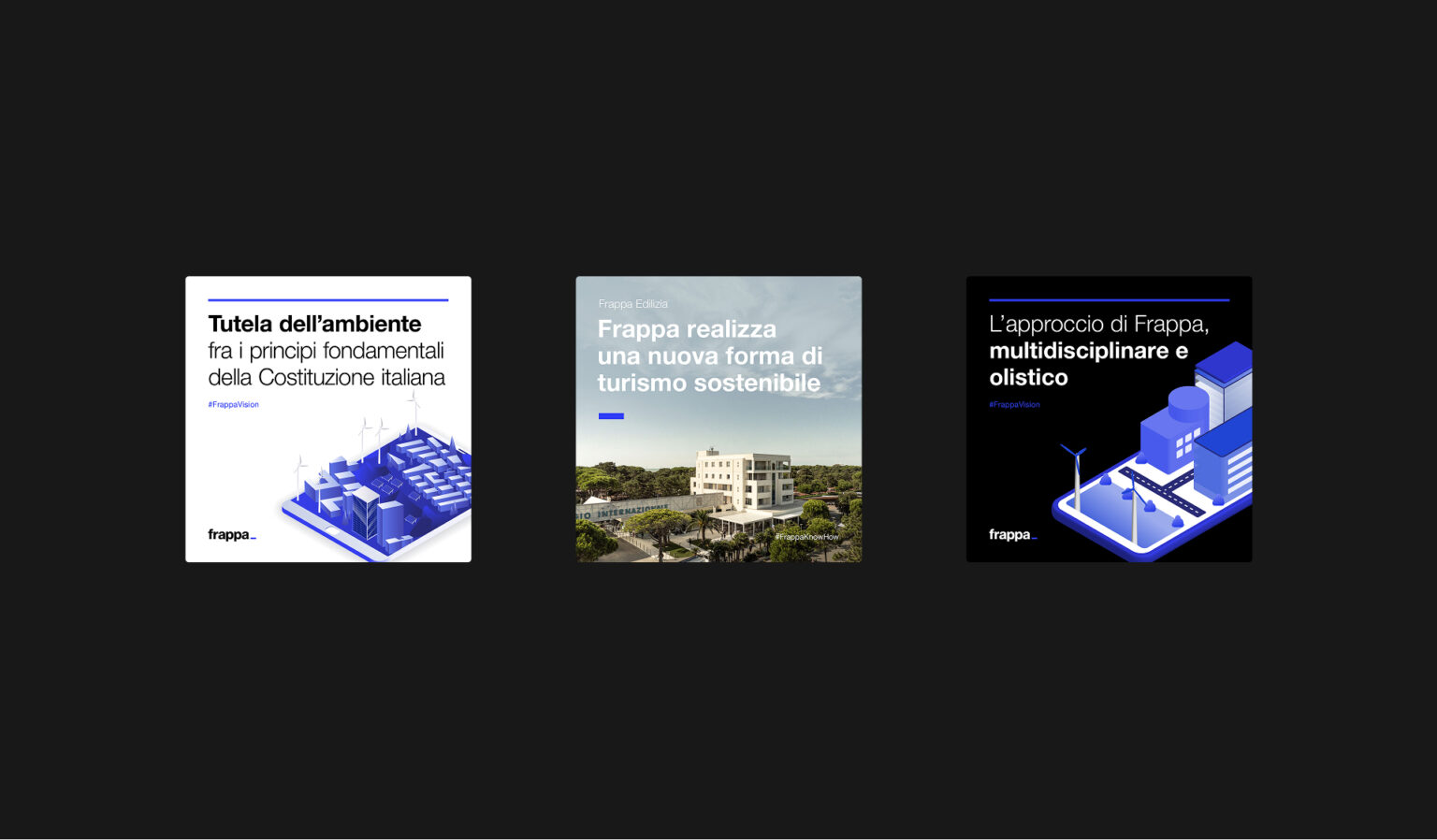 Il progetto ha trovato ulteriore consolidamento nella definizione di una presenza coordinata sui canali social e negli strumenti online, rafforzando la capacità del brand di dialogare con i propri stakeholder. La content strategy è stata pensata per restituire la visione olistica di Frappa, con contenuti che alternano la valorizzazione dei progetti a riflessioni sul rapporto tra uomo e ambiente. L’integrazione tra sito, social e strumenti digitali costruisce così un ecosistema coerente, in cui ogni touchpoint contribuisce a veicolare la stessa idea di edilizia come coesistenza e rigenerazione.